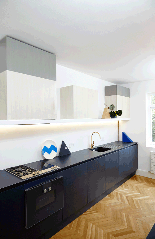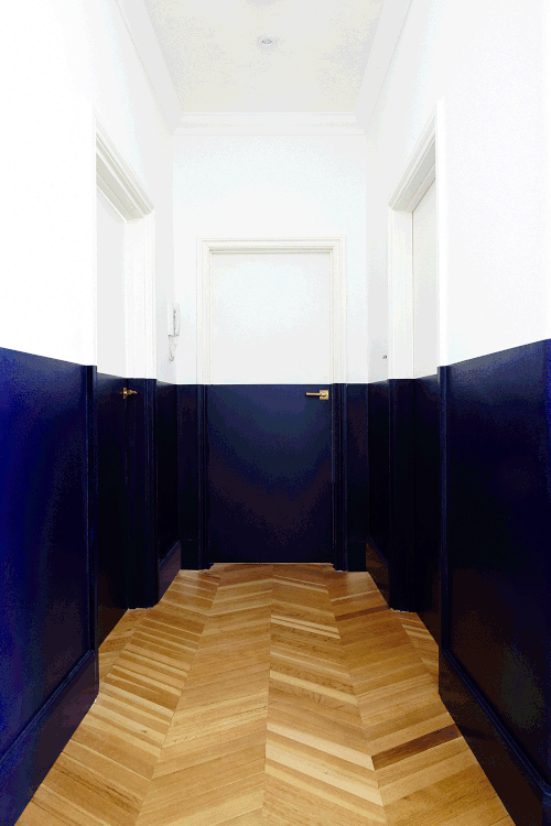 A graphic grid of solid ash strips frames the colour-blocked carpet wall patterns and integrates deep window apertures of ash panelling, unifying the varied styles of doors and original window frames. Strips of solid ash have also been used to create a linear cladding for the mezzanine stairs, integrating hidden storage, and also forming a screen that contains the stairs from the foyer. Both staircases have been clad with bespoke ash treads.