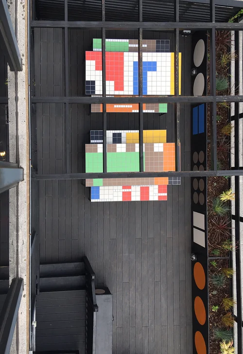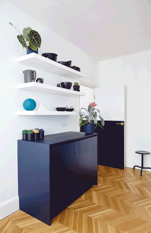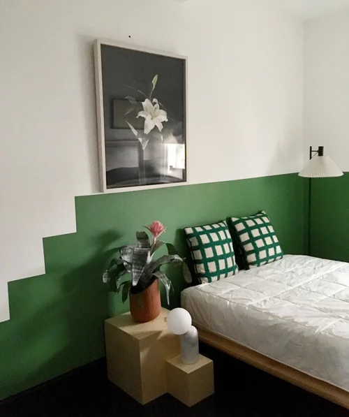 To balance the grounding qualities of the natural colours and materials, Rhonda has introduced a palette of bolder pop tones, muted by the materials that host them. The goat’s wool carpet on the walls is dyed in a variety of playful colours, softened by flecks found naturally in the wool, and pigment-stained ash in green, yellow, aqua, and blue is used for various pieces of furniture and the kitchens.