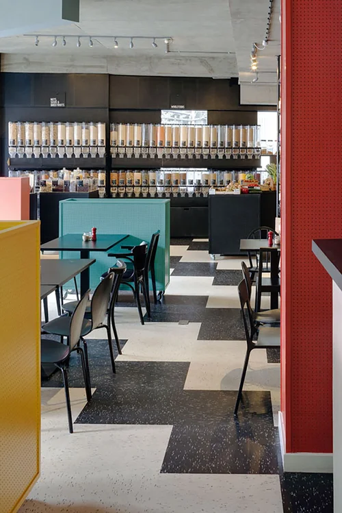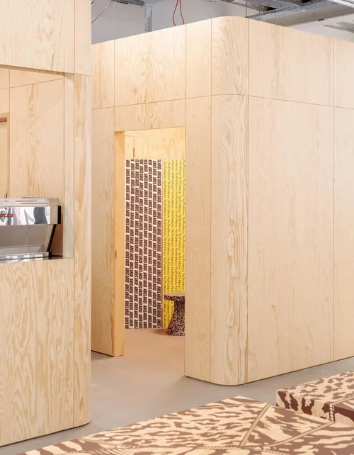 For Omlet’s four kitchen areas, Rhonda brought on board the London-based design studio HØLTE as the ideal collaborators to realise her colour-blocked kitchen concept. The two studios worked together to develop bespoke shades in ash so that each kitchen could have its own personality – an intentional, colour-coded part of the wayfinding in the vast new building. The colours – dark and light blue, yellow and green – inform the neighbouring wall treatments, creating distinct colour-coded zones within the space.