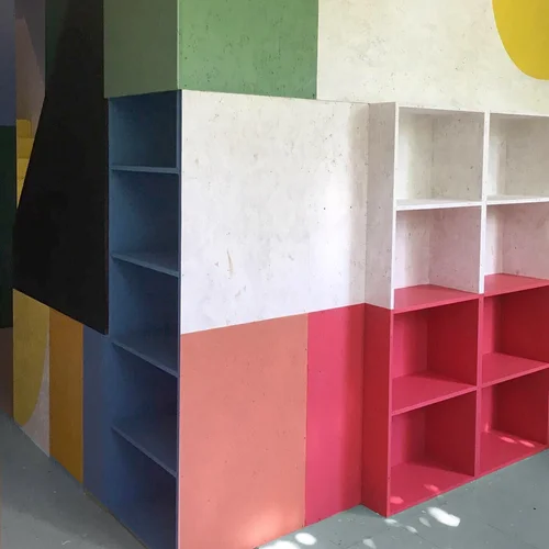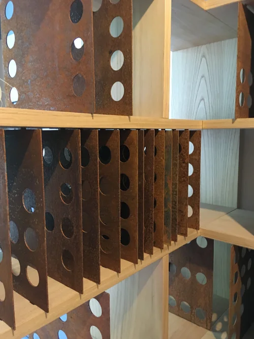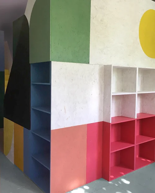 Improving the acoustics – and emphasising the nod to nature – still further, Studio Rhonda introduced vast carpeted walls using Tretford goats’ wool fitted over acoustic batten cladding. The walls beneath the mezzanine are clad with raw cork, hand-painted with murals in Indian inks. This combination of natural colours and textured materials creates an atmosphere of depth and cosiness, making the new Omlet office an inherently relaxing space.